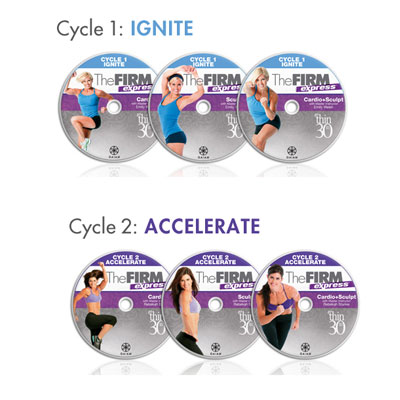Item DescriptionThe Firm Express Get Thin In 30 uses cutting edge science to help deliver fast weight loss. It is a total-body exercise solution that can help you get fit in just 30 days. All it takes is 3, 20 minute workouts a week. The secret is an amazing fitness breakthrough called Mini Bursts. It features quick blast intervals combined with The Firm’s already effective cardio and sculpt fitness methods. You can exercise less and get faster results. With the Firm Express workouts, you can burn up to 9 times more fat than traditional cardio exercises. Plus your body will continue to burn away calories long after your workout has ended. The Firm Express is a 30-day, four cycle system that is specifically sequenced to provide optimal weight loss in just 30 short days. Each cycle is separated into 3 different workout DVDs. Cycle 1: Ignite – Rev your body and get ready for great results Cycle 2: Accelerate – Carve and firm muscles while blasting calories Cycle 3: Turbocharge – Lean out your physique with the best in cardio coupled with muscle toning exercises Cycle 4: Overdrive – Blasting away belly fat and sculpt beautifully defined muscles The Firm Express Get Thin In 30 comes with: